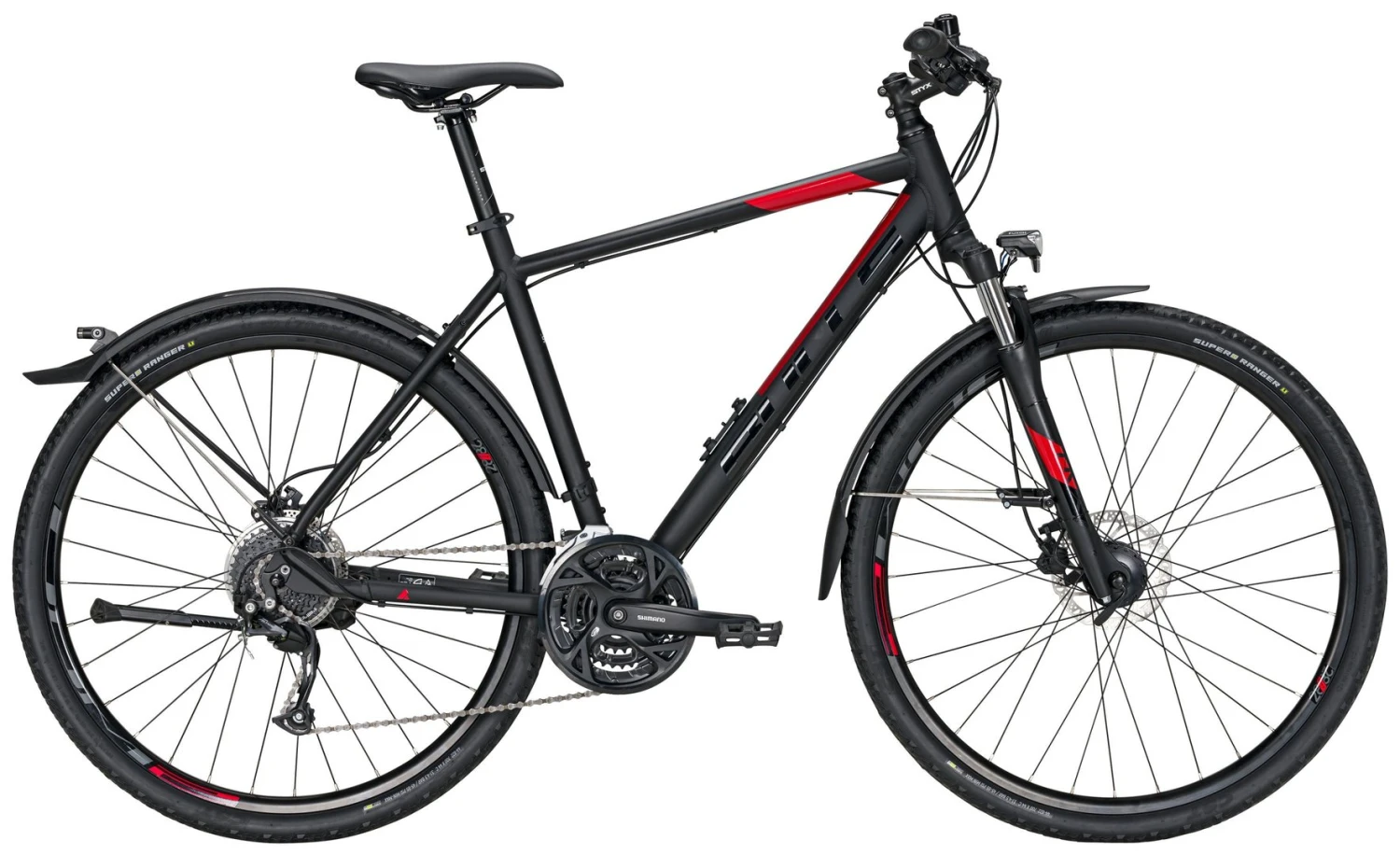 7005-Alu-Biaxial-Rahmen, Suntour NVX Federgabel einstellbar, 27-Gang Shimano Altus Schaltwerk, Schalthebel Umwerfer und Kurbeln, Tektro HD-T275 Disc-Bremsen, Bulls DDM-2 Disc Hohlkammerfelgen, DH-3D32 Nabendynamo, 50 Lux LED-Lampe mit Sensor und Standlicht, Standrücklicht hinten auf dem Schutzblech, SKS Velo 55 Steckbleche mit Streben, Pletscher Flex KSA-40 Ständer