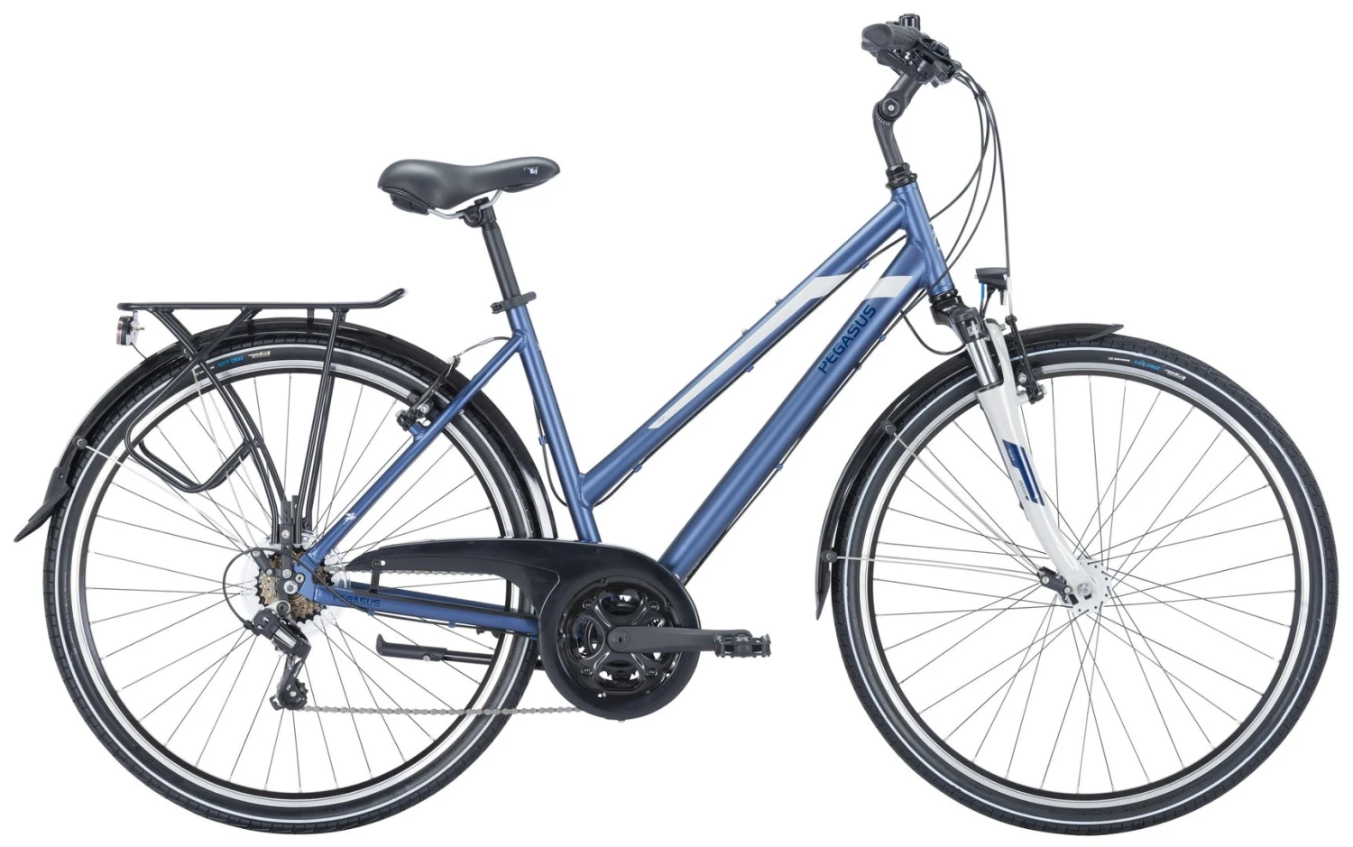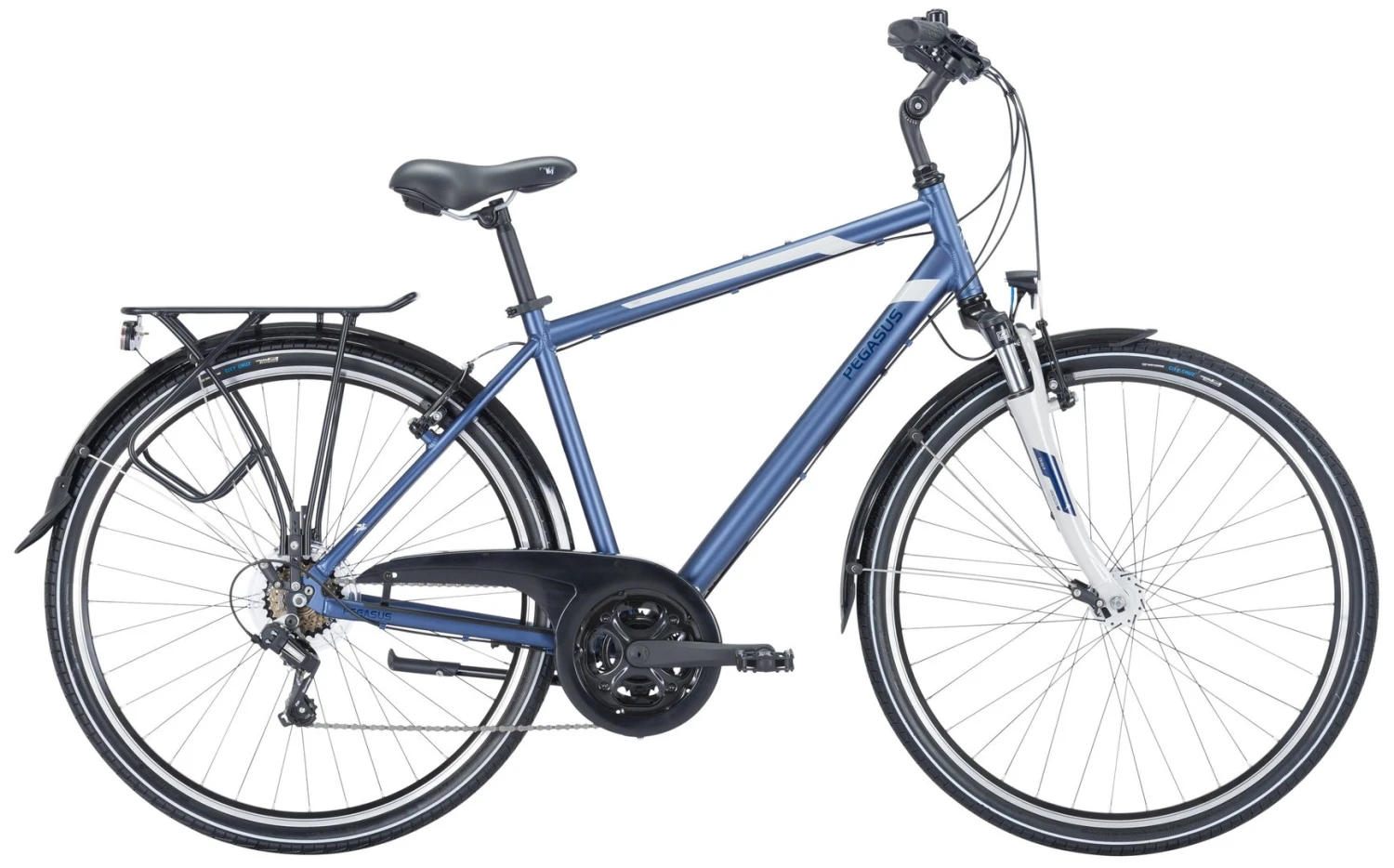 Alu Rahmen, Suntour CR-8V Federgabel, Shimano Tourney 21-Gang Schaltwerk und Umwerfer, Altus EZ-Fire, Samox Kurbeln mit gekapseltem Lager, Alu V-Bremsen, Hohlkammer-Felgen, verstellbarer Vorbau, Nabendynamo, 30 Lux LED-Lampe, Standrücklicht, Kunststoffschutzbleche, Kettenschutz, Monkeyload-Gepäckträger